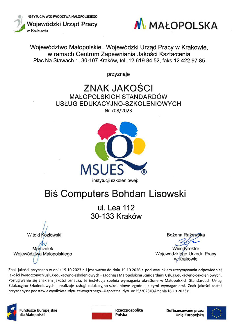 Firma Biś Computers posiada certyfikat Znak Jakości Małopolskich Standardów Usług Edukacyjno-Szkoleniowych gwarantujący wysoką jakość prowadzonych szkoleń.